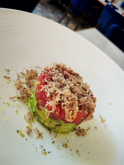 Le tartare de thon rouge simplement appréhendé, filet d'huile d'olive vierge et guacamole d'avocat, tout de naturel « vêtu », et la sole à la façon du chef, en vérité grillée et désarêtée, sa purée de pomme de terre et son beurre fondu, feront montre d'une belle appréhension et d'une évidente conviction.