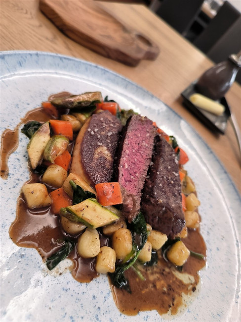 Le tartare de bœuf, pomme de terre au grué de cacao et algues poivrées, filet d'huile d'olive, tout en séduction des papilles, et la pièce de bœuf, ce jour-là une aiguillette Baronne, son foie gras poêlé, ses légumes et gnocchis au beurre de truffe, sauce Lyonnaise, voilà bien une identité et un (grand) talent qui se révéleront à moi sous les meilleurs auspices.