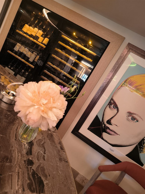 On ne vient pas à l'Amandier (ex Roger Vergé) comme on va au bistrot du coin, non pas, on grimpe empli d'impatience les marches de cet ancien moulin à huile menant vers la salle aux pressoirs, ou pour faire plus rapide, depuis quelques mois, via l'ascenseur translucide qui mène directement à la terrasse avec vue à 200 ° (au moins) sur la campagne Mouginoise et les diverses sculptures contemporaines notamment cette tête de Picasso qui fixe du regard le convives de cette table hors du commun.
