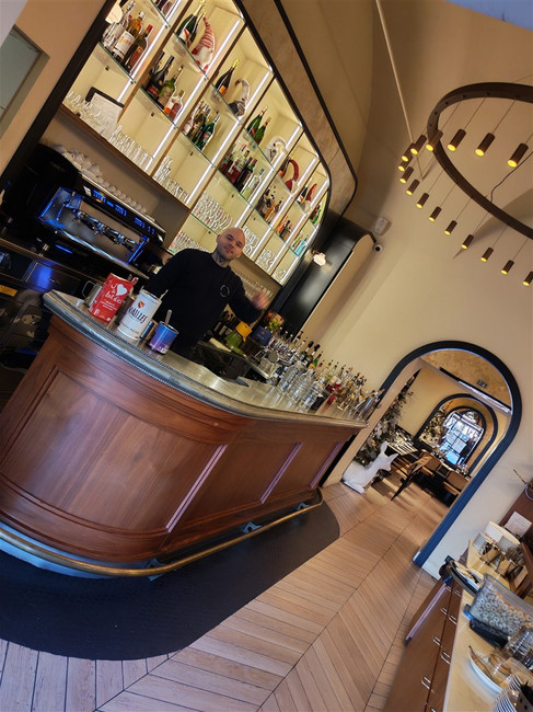 Mais la curiosité (elle aussi historique) ce sera cette salle du fond, ses miroirs alignés et son vitrail en rosace multicolore au plafond, une déco certes remise au goût du jour mais, cependant, imprégnée d'une âme encore bien présente.