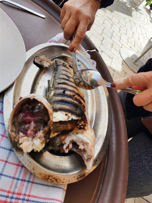 Nadège, la responsable de salle, malgré sa « frayeur » des guêpes viendra à préparer le loup de Méditerranée de 700 bons gr que je lui aurais commandé, et ce n'est pas Lisa soucieuse de me voir m' « épanouir » gustativement, en un mot fondre sur la carte le couteau entre les dents, qui me démentira moi qui opterai pour une certaine légèreté.