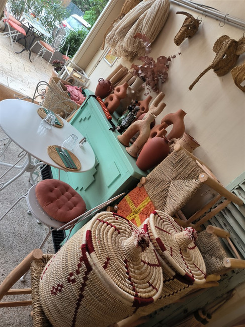 Mon déjeuner en ce 1er Juillet se verra placé sous le signe de l'artisanat du Moyen Orient et, plus précisément, berbère, donc Marocain, ainsi tapis, suspensions, tissus pliés, poufs, poteries, prêt-à-porter, mugs (là Hollandais) s'associeront-ils ici en ordre dispersé, en fait un tourbillon de savoir-faire issu d'un artisanat local issu d'autres contrées, ...